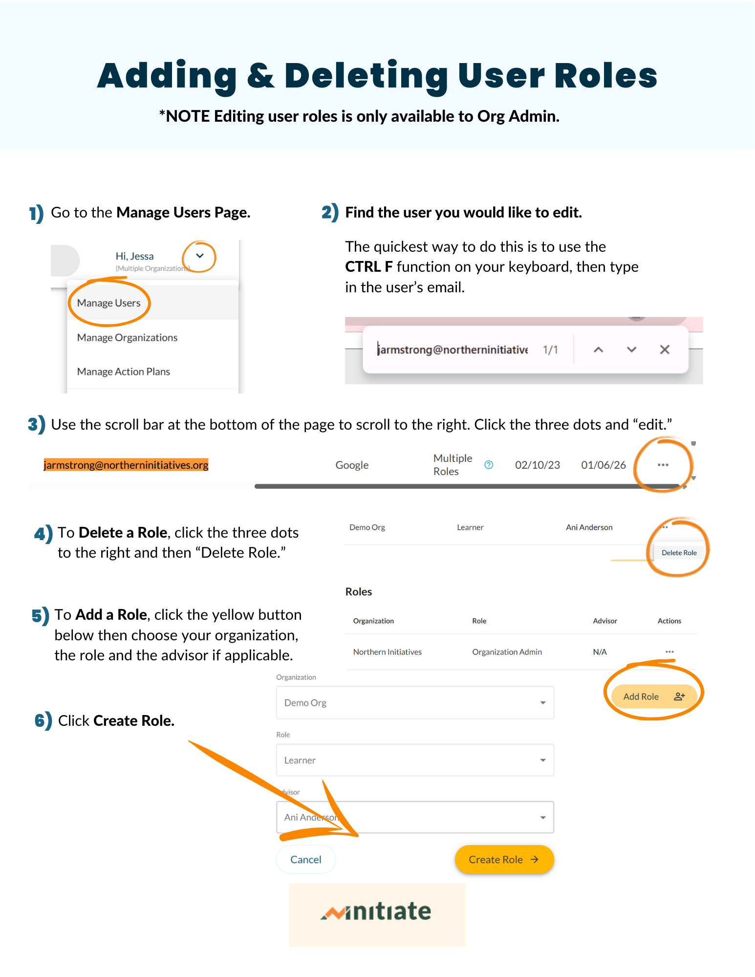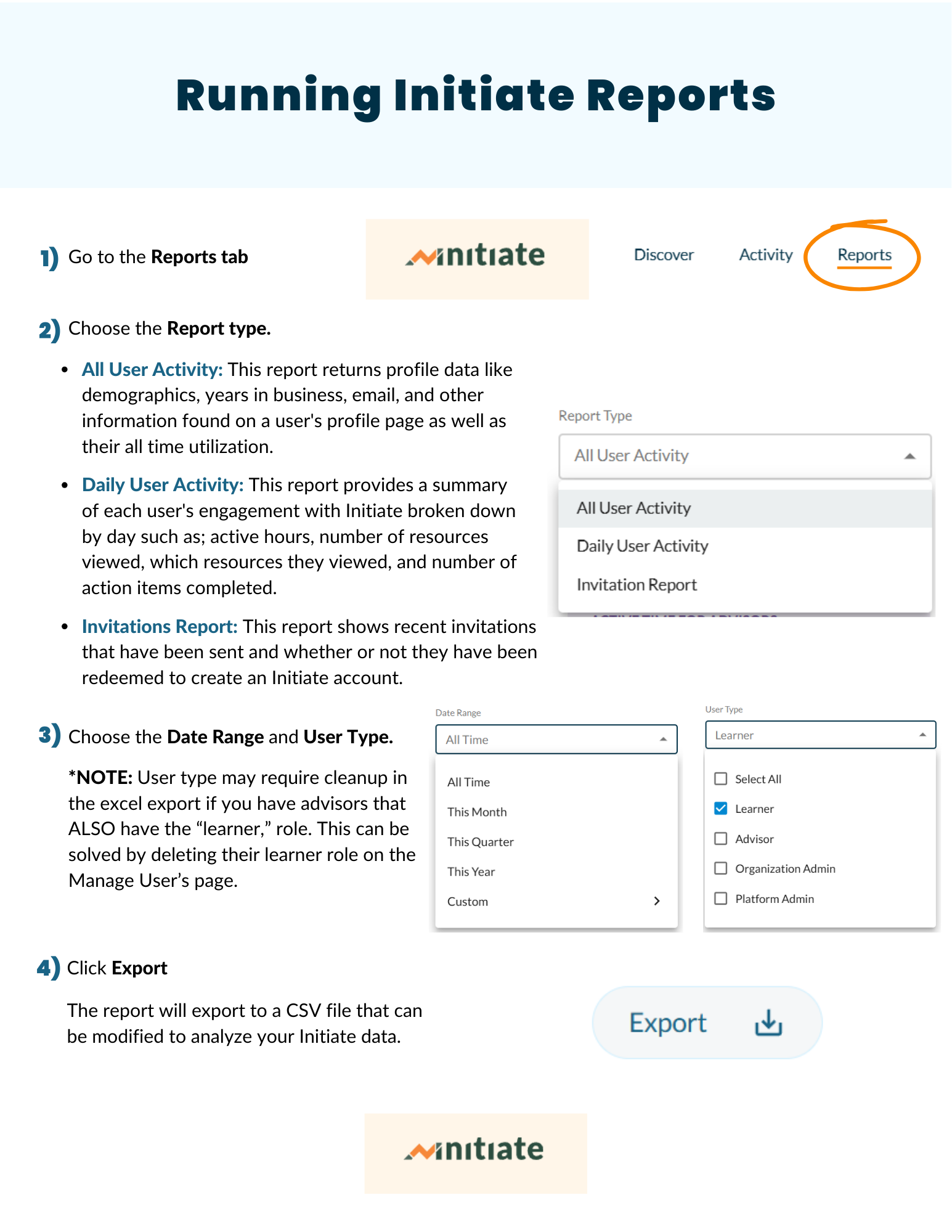 Initiate How To's Use these instructional guides as a reference for platform functionality. Types of Initiate Reports and How to Export Business Self Assessment Report: How to export Adding & Deleting User Roles